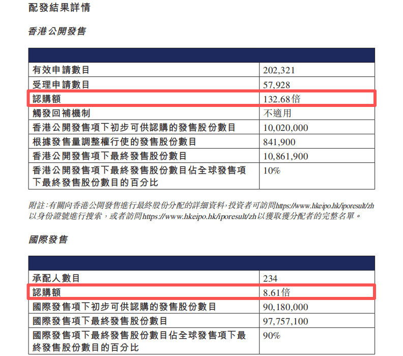 赛力斯港股IPO全球发售约1.09亿股H股,包括香港公开发售1086.19万股H股,认购额达132.68倍;国际发售9775.71万股H股,认购额达8.61倍。