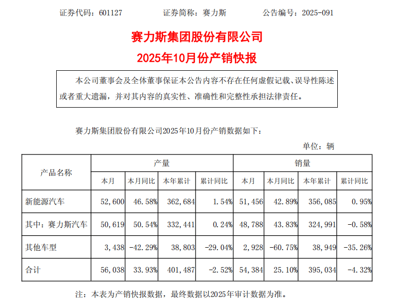 产销快报显示,赛力斯新能源汽车2025年10月销量达5.15万辆,同比增长42.89%;2025年前10月销量达35.61万辆,同比增长0.95%。