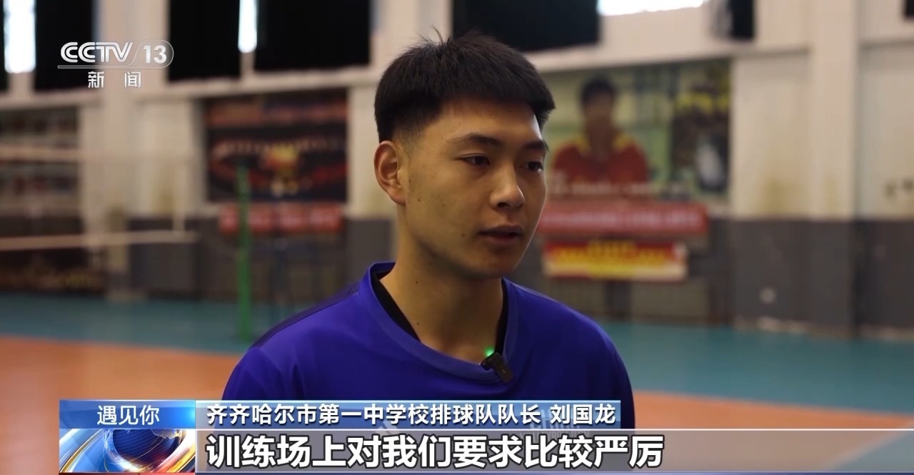 齐齐哈尔市第一中学校排球队队长 刘国龙:训练场上对我们要求比较严厉,我们大家都认可,因为严师出高徒。但在平时的日常生活中,他就像一个慈祥的父亲似的,日常生活中的琐事他都会关照、关心我们。仔细想想,我要是没来到这个排球队,我可能现在出去打工,但是借着球队这个平台,如今能取得这么好的成绩,也是非常荣幸。