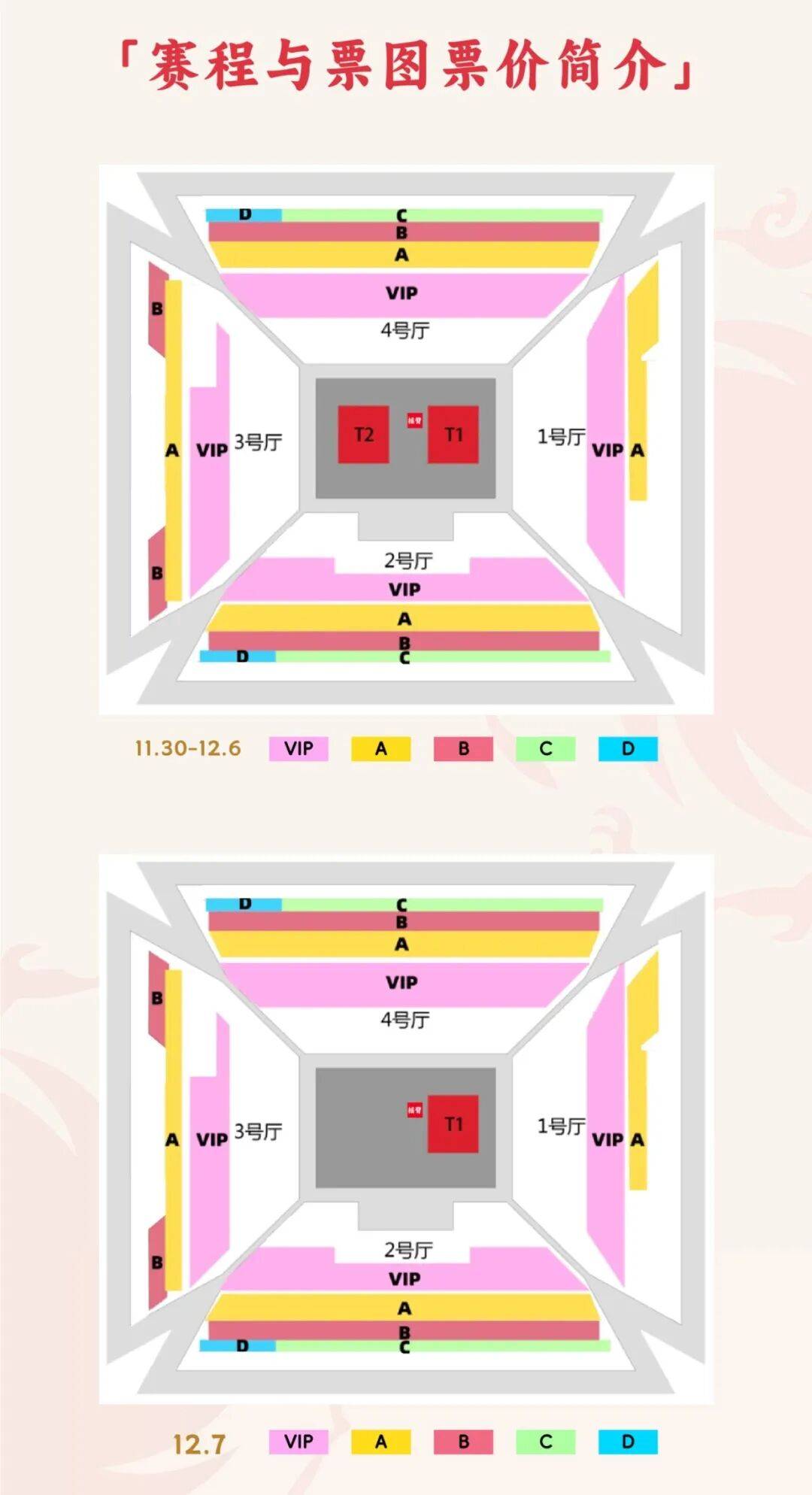 3.所有比赛场次开始、结束时间及参赛选手名单,以ITTF公布的实际赛程为准;由于赛事性质日程表的更改或任何因故取消的比赛,部分座位因赛时安全要求或非固定转播及竞赛设备器材安置(如裁判椅、摄影摇臂或转播三脚架等设备设施)导致的视野受限不应视为“重大变更”,球员出场舞台的视野受限不视为视野遮挡,以上均不予退款、换票或其他补偿。