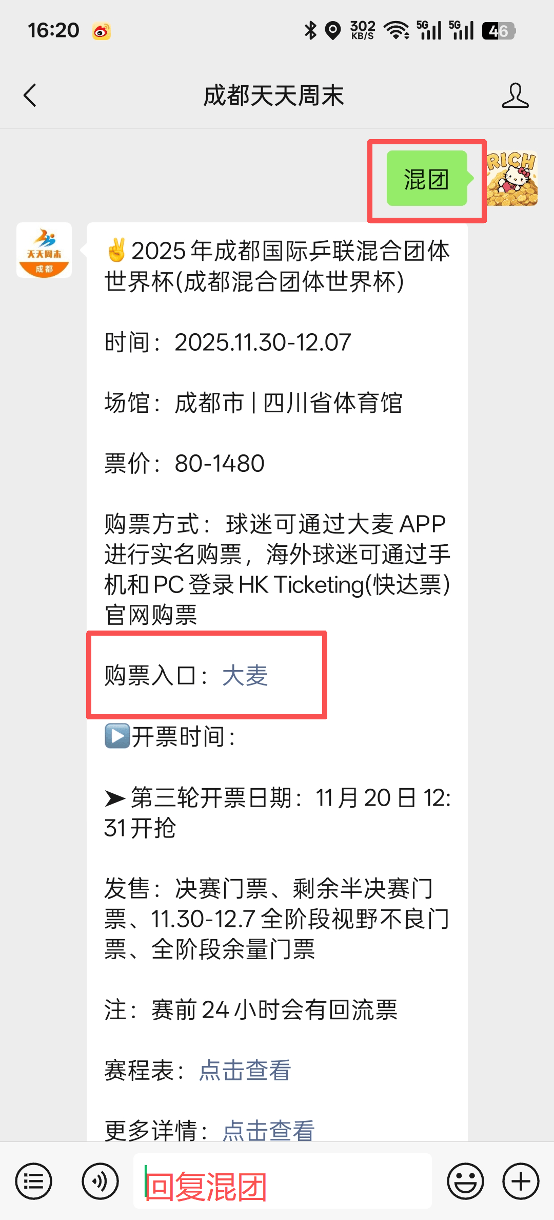 大麦APP,海外球迷可通过HK Ticketing(快达票)官网购票。大家也可以扫描下方二维码,进入成都天天周末公众号,在对话框回复【混团】直达购票入口,查看后续赛程、参赛名单、及对阵表、出场名单、直播观看等信息。